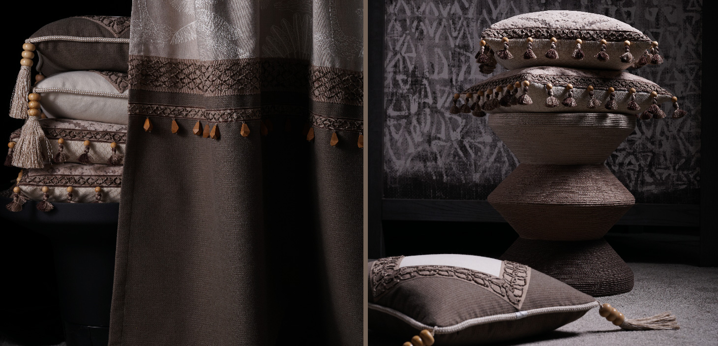 該系列產(chǎn)品花型立體感強(qiáng),大膽的運(yùn)用混色異型棉紗來營造自然肌理感,可兼具多種工藝的視覺呈現(xiàn)和使用效果。
